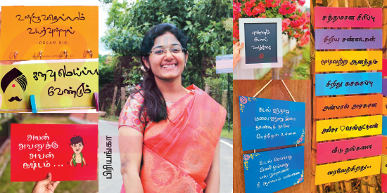 விருதுநகரைச் சேர்ந்தவர் பிரியங்கா ராமன். பொறியியல் பட்டதாரியான இவர், கலை மீது இருக்கும் ஆர்வத்தில், தன் ஐடி வேலையை உதறி இப்போது அழகு தமிழில் பாரதியாரின் கவிதைகள், ஆத்திச்சூடி என பல நீதி நூல்களில் இருக்கும் தமிழ் பழமொழிகளை அழகிய எழுத்துருவில் எழுதி அதை கஸ்டமைஸ்டு பரிசுகளாகவும், ரிட்டன் கிஃப்ட்களாகவும், பெரிய நிறுவனங்களின் ஊழியர்களுக்கு கொடுக்கும் பண்டிகைகால பரிசாகவும் மாற்றி தன் தொழிலை விரிவுப்படுத்தி வருகிறார்.