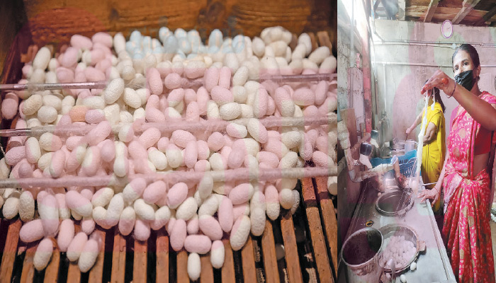 களைத் தடவிக் கொண்டு தான் இவர்கள் வேலையினை செய்கிறார்கள். அதனை நிறுவனமே தந்து உதவுகிறது. மேலும் பட்டு நூல் உற்பத்தியில் கிடைக்கும் லாபம் மற்றும் நஷ்டம் குறித்து விளக்கமளித்தார் வேதா. ‘‘பட்டுக்கூடுகள் சீசனுக்கு ஏற்ப அதன் விலை மாறுபடும். சில சமயம் 700 ரூபாய் முதல் 800 ரூபாய்க்கு வாங்குவோம். ஒரு சில நேரங்களில் 450 ரூபாய்க்கும் விற்கப்படும். அதனை வாங்கி கூட்டில் இருந்து நூலை எடுத்து அதனைதான் விற்பனை செய்கிறோம்.