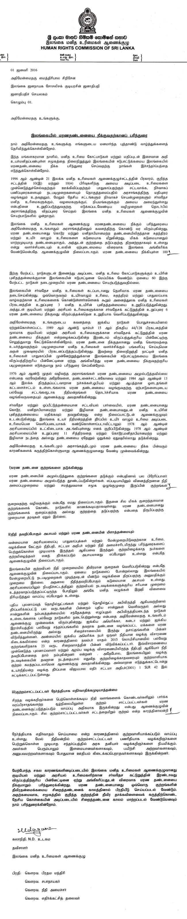 • மரண தண்டனையை நீக்குமாறு ஜனாதிபதியிடம் கோரிக்கை (கடிதம் இணைப்பு)…!!