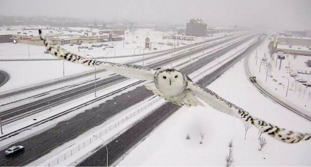 கனடாவில் பனிப்பொழிவுகள் ஆரம்பித்துள்ள நிலையில், நடுவானில் விமானம் பறப்பது போன்று பனி ஆந்தை ஒன்று பறப்பது மொன்றியலின் போக்குவரத்து கமெராவில் பதிவாகியுள்ளது.