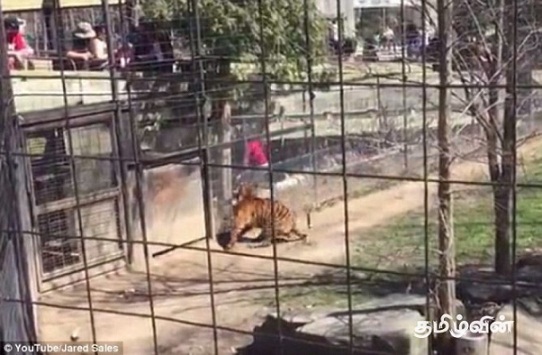புலி வேலிக்கு அருகிலேயே சுற்றி திரிவதை பார்த்த அந்த பெண் எவ்வித அச்சமும் இன்றி திடீரென வேலிக்குள் குதித்துள்ளார்.