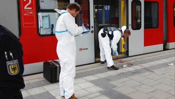 ஜெர்மனி நாட்டில் முனிச் நகர் அருகேயுள்ள கிராபிங் ரெயில் நிலையத்தில் உள்ளூர் நேரப்படி அதிகாலை 4.50 மணிக்கு ‘எஸ் பான்’ பயணிகள் ரெயிலில் ஏறிய மர்ம நபர் தீடீரென அருகில் இருந்த ஒருவரை கத்தியால் வெட்டினான். அடுத்தடுத்து மேலும் 3 பேரை அவன் கத்தியால் வெட்டிச்சாய்த்தான். இதனால் அந்த ரெயில் நிலையத்திலும், ரெயிலிலும் பெரும் பதற்றம் தொற்றிக்கொண்டது. பயணிகள் அலறியடித்துக்கொண்டு ஓடினார்கள்.