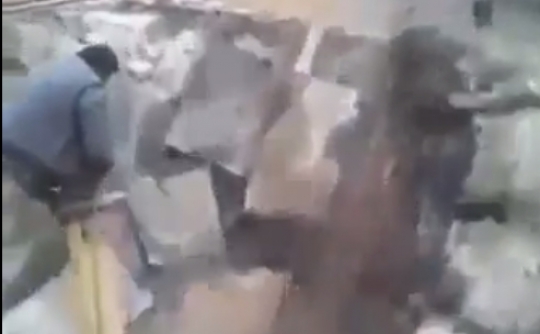 அவ்வாறே வீட்டின மேற்பகுதியினை முற்றாக தகர்ப்பதற்காக ஒரே இரு இரும்பு தூணில் இருந்து பணிபுரியும் இந்த நபரின் துணிச்சல் மெய்சிலிர்க்க வைப்பதாக இருக்கின்றது.