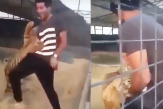 இந்த நிலையில் அவரது நண்பர் ஒருவர் அனுமதியுடன் இவர் கூண்டுக்குள் சென்று புலியுடன் விளையாட்டு காட்டியுள்ளார். இந்த சம்பவத்தை புலியின் உரிமையாளரான நண்பர் தமது கேமிராவில் பதிவு செய்து வந்துள்ளார்.