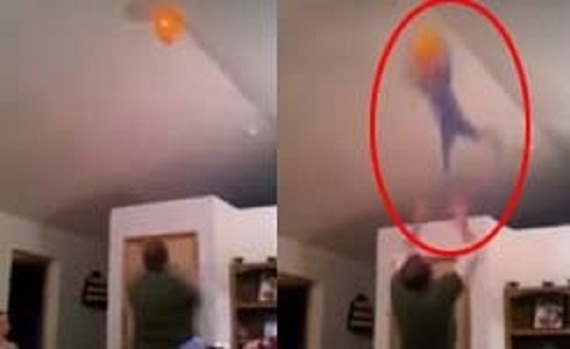 ஆம், தந்தை ஒருவர் பலூன் ஒன்றினை வீட்டின் சீலிங் பகுதியில் நிலை நிறுத்திவிட்டு தனது மகனை தூக்கி எறிந்து அந்த பலூனை எடுக்கச் செய்துள்ளார். அத்துடன் நிறுத்திவிடாது அவர் அக்காட்சியை வீடியோ பதிவு செய்து இணையத்தளத்தில் பதிவேற்றியுள்ளார். இதனால் குழந்தையின் தைரியத்தை பாராட்டுபவர்கள் ஒரு புறம் இருக்க பலர் இச் செயலை கண்டித்துவருகின்றனர்.