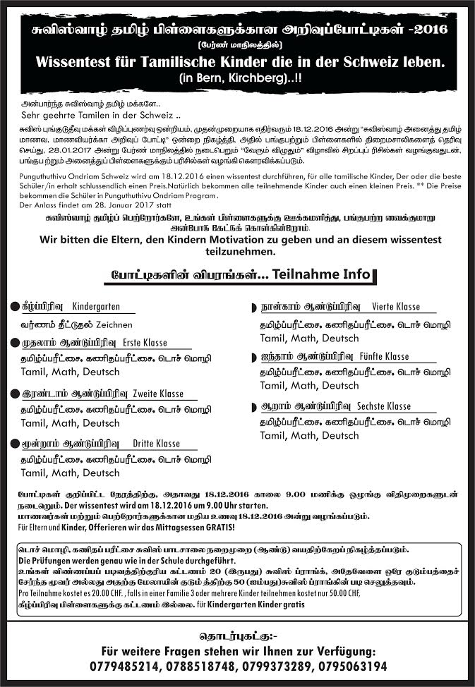 • 18.12.2016 இல், பேர்ண் மாநிலத்தில், சுவிஸ்வாழ் தமிழ் பிள்ளைகளுக்கான “அறிவுப்போட்டிகள்”..!!