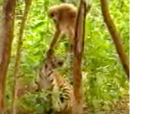 • குரங்கு சேட்டையை பார்த்திருகிறீர்களா? – இரண்டு புலிகளை விரட்டும் குரங்கை பாருங்கள்..!! [வீடியோ]