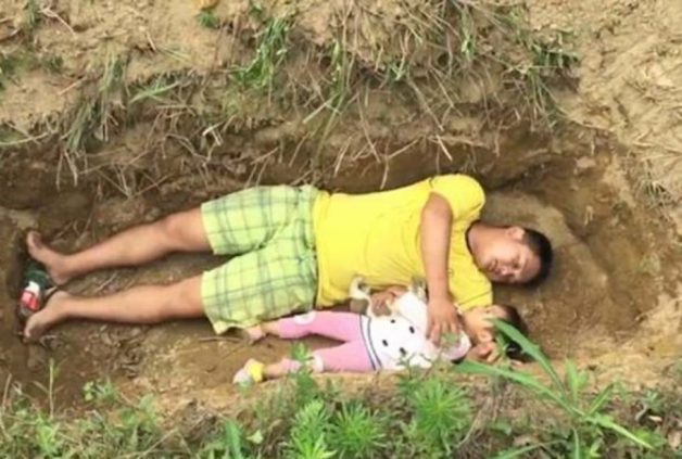 இதனால் குழந்தையின் தந்தை இதற்கு மேல் சிகிச்சை மேற்கொள்ள முடியாது என்ற எண்ணத்தில், அங்குள்ள ஒரு பகுதியில் சவக்குழி ஒன்றை தோண்டி அங்கு இருவரும் விளையாடி வருகின்றனர்.