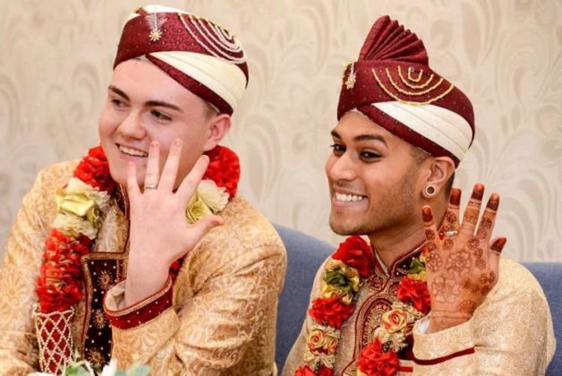 மகிழ்ச்சியான மணமகன்களான ஜாஹெத் சௌதிரி (வயது 24) மற்றும் சீன் ரோகன் (வயது 19) பாரம்பரிய உடையில் Walsall Registry Office-ல் திருமணம் செய்து கொண்டுள்ளனர்.