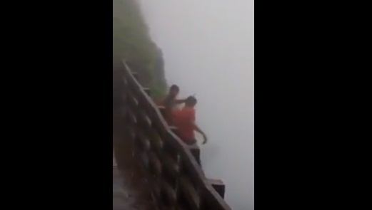 சுற்றுலா தளத்திற்கு சென்ற இரண்டு இளைஞர்கள் குடிபோதையில் மது குடித்துக்கொண்டே, பள்ளத்தாக்கின் தடுப்பு சுவரை மீது ஏறி அமர்ந்துக்கொண்டு விளையாட்டு காட்டுகின்றனர். இதனை அங்கிருந்த நண்பர்கள் காணொளியாக பதிவு செய்தது மட்டுமின்றி உற்சாகமும் படுத்தியுள்ளனர்.