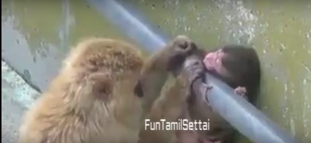 தாயின் அருகே விளையாடிக்கொண்டிருந்த குரங்கு குட்டி ஒன்று அங்குள்ள கம்பி ஒன்றில் மாட்டிக் கொண்டுள்ளது.