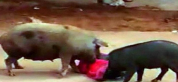 சாலையில் நடந்து சென்ற மூதாட்டியை தாக்கிய பன்றிகள்..!! (வீடியோ)