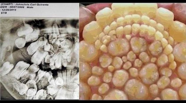 ஓடோன்டோமஸ்! ஓடோன்டோமஸ் (Odontomas) என்ற பிரச்சனையால் தான் இந்த சிறுவன் பாதிக்கப்பட்டிருந்தான். இது ஏனோதானோவென்று பற்கள் போன்ற கட்டிகள் வளரும் பாதிப்பு. இது மஞ்சள் நிற திசு மேற்பரப்புடன் காணப்படுகிறது. இதனால், இது பற்கள் போன்ற தோற்றமளிக்கும்.