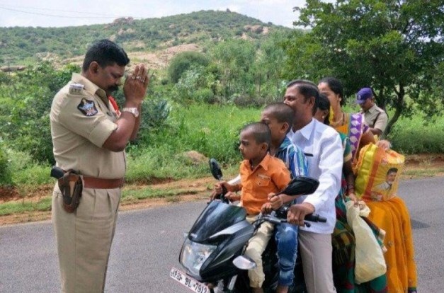 இந்நிலையில், மீண்டும் மனைவி, 2 மகன், தாய் என பைக்கில் ஹனுமந்த்ரையா வருவதை கவனித்த காவல் ஆய்வாளர் மனம் நொந்து அவரை பார்த்து இரண்டு கைகளையும் கூப்பி கும்பிடு போட்டார்.