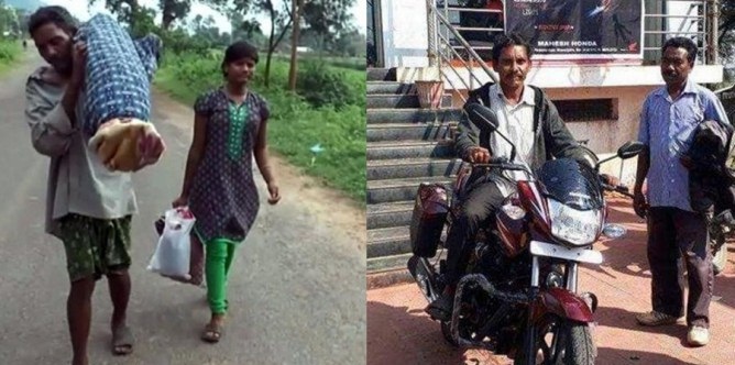 • மனைவியின் உடலை அன்று பரிதாபமாக தோளில் சுமந்து சென்றவர் இன்று இரு சக்கர வாகனத்தில்..!!