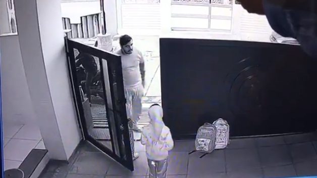 தாய் ஒருவர் தனது இரண்டு குழந்தைகளை பள்ளிக்கு அனுப்பிவைக்க தனது வீட்டு வாசலில் நின்று கொண்டிருக்கிறார்.