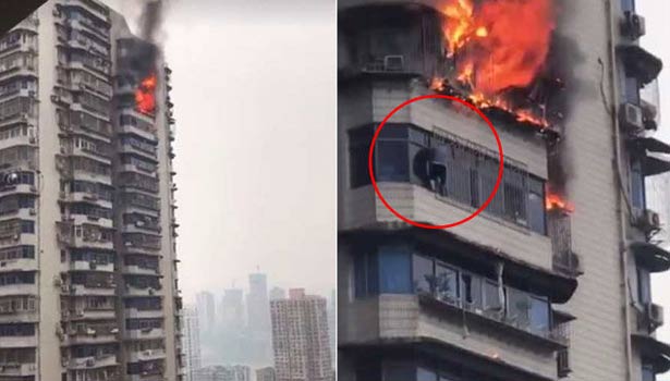 சீனாவின் சாங்குங் நகரில் உள்ள அடுக்குமாடி குடியிருப்பில் தீவிபத்து ஏற்பட்டது. 23 தளங்கள் கொண்ட அந்த அடுக்குமாடி குடியிருப்பின் 18-வது மாடியில் குடியிருந்த நபர் தீப்பிடித்து எரிந்து கொண்டிருந்தது. அதன் கீழ் தளத்திற்கும் தீ பரவியது. இதனால் அந்த தளத்தில் இருந்த ஒருவர், உயிரை காப்பாற்றிக்கொள்வதற்காக மாடி பால்கனிக்கு வெளியே உள்ள ஜன்னலை பிடித்து தொங்கினார்.