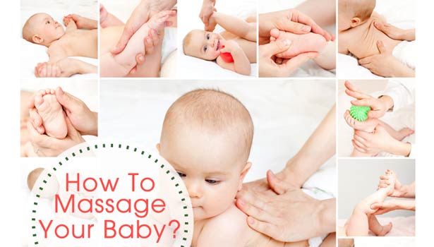 * மசாஜ் செய்வதற்குரிய எண்ணெய்யை பயன்படுத்தி மெதுவாக மசாஜ் செய்யத் தொடங்க வேண்டும். கைவிரல்களின் அழுத்தம் மென்மையாக இருக்க வேண்டும். ஏனெனில் குழந்தைகளின் எலும்பு பகுதிகளும், இணைப்பு பகுதிகளும் வலிமையாக இருக்காது.