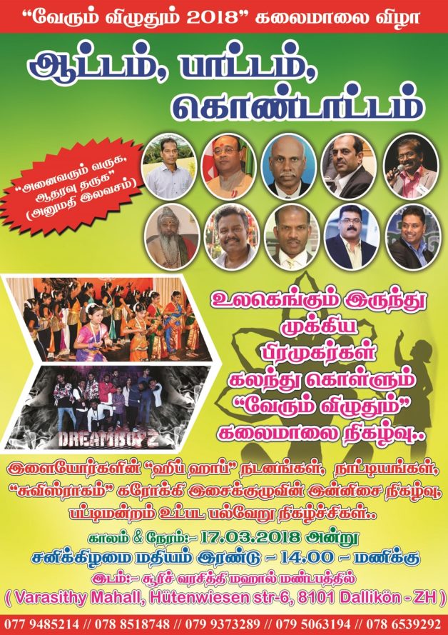 சூரிச் வரசித்தி மஹால் மண்டபத்தில் எதிர்வரும் 17.03.18 சனிக்கிழமை மதியம் 02.00 மணிக்கு நடைபெற இருக்கும் “வேரும் விழுதும்” கலைமாலை நிகழ்வு…