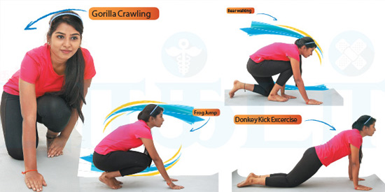 கொரில்லாவை போல நகரும் பயிற்சி இது. படத்தில் காட்டியுள்ளதுபோல் தரையில் கால்களை மடக்கி குதிகாலில் அமர்ந்துகொண்டு, இரண்டு கைகளையும் முன்பக்கமாக நீட்டி தோள்பட்டைக்கு நேராக வைக்க வேண்டும். உடல் எடை முழுவதும் உள்ளங்கையில் வைத்து ஊன்றி, கால்களை மேலே தூக்கி குதித்து முன்னால் நகர வேண்டும். இப்போது எடையை கால்களில் கொண்டுவந்து, கைகளை மீண்டும் முன்பக்கமாக நகா்த்திக்கொண்டு பழையபடி கால்களை மடக்கி உட்கார வேண்டும். இதேபோல் 5 முறை குதித்துக்கொண்டே முன்னோக்கி நகர வேண்டும்.