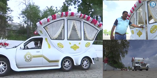 மத்தியப்பிரதேசம்: மத்தியப்பிரதேச மாநிலம் போபாலில் திருமண நிகழ்ச்சி ஏற்பாட்டாளர் ஹமீத் கான் என்பவர் தனது ரோல்ஸ் ராய்ஸ் காரை திருமண ஊர்வலத்தின்போது மணமக்கள் ஒய்யாரமாக அமர்ந்து பயணிக்கும் வகையில் வடிவமைத்துள்ளார். இந்த காருக்கு ராயல்ஸ் வெட்டிங் கார் என பெயர் சூட்டிய அவர், அதிக லாபத்திற்காக இந்த ஏற்பாட்டை செய்யவில்லை, நடுத்தர மக்களும் செல்வந்தர்கள் போல் உணர வேண்டும் என்பதற்காக இந்த ஏற்பாட்டை செய்திருக்கிறேன் என்று கூறியுள்ளார்.