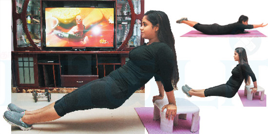 டி.விக்கு எதிரே, அமர்ந்து பார்க்கும் சோபாவிற்கு முன் போடப்பட்டிருக்கும் காபி டேபிளை உபயோகித்து இந்த உடற்பயிற்சியை செய்யலாம். படத்தில் உள்ளதுபோல் இரண்டு கைகளையும் பின்புறமாக, தோள்பட்டைகளின் அகலத்திற்கு விரித்து காபி டேபிளின் விளிம்பில் ஊன்றி வைத்துக் கொள்ளவும். பின்னர் கால்களை முன்புறம் நீட்டி குதிகாலால் ஊன்றிக் கொள்ளவும்.