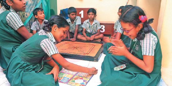 தமிழ் வழி மாணவர்களுக்கு ஆங்கிலம் கிடையாது. ஆங்கில வழி பயில்வோருக்கு தமிழ் கிடையாது. அரசுத் தேர்வும் இப்படித்தான் இருக்கும். எங்கள் மாணவர்களுக்கு தேர்வில் ஒரு மணி நேரம் கூடுதலாக வழங்கப்படும். 10ம் நிலை வரை 4 பாடங்கள்தான் அவர்களுக்கு. தமிழ், கணக்கு, அறிவியல், சமூக அறிவியல் என 400 மதிப்பெண்கள் மட்டுமே. பிறகு +2 தேர்வுக்கு ஆங்கிலம்1, ஆங்கிலம் 2 என தனி பயிற்சி கொடுத்து ஆங்கில மொழியினைக் கற்றுத் தருவோம். இதற்கான தேர்வை தனியாக நடத்தி தனிச் சான்றிதழ் வழங்கப்படும். அப்போதுதான் அரசுப் போட்டித் தேர்வுகளை அவர்களால் எதிர்கொள்ள முடியும். எங்கள் மாணவர்கள் தொடர்ந்து 3 ஆண்டுகளாக மதிப்பெண் எடுப்பதில் மாநில அளவில் முதலிடத்தில் உள்ளனர்.
