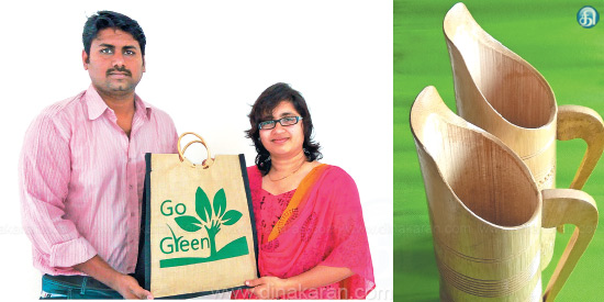 ஆரம்பத்தில் இருந்தே இது புழக்கத்துல இருக்கு. ஆனா, பெரிய அளவுல யாரும் மார்க்கெட் செய்யலை. நாங்க செய்யறோம். கோதுமை மற்றும் சோளமாவை தண்ணீர் ஊற்றி சப்பாத்தி மாவு பதத்துக்கு பிசைந்து தேவையான வடிவம் அமைத்து பேக் (bake) செய்யணும். வெந்த பிறகு, சாப்பிடும் தன்மைக்கு மாறிடும். இந்த ஸ்பூனால் சாப்பிட்ட பிறகு, ஸ்பூனையும் கடிச்சு சாப்பிடலாம்! ஒருவேளை தூக்கி எறிந்தாலும் அது மக்கிதான் போகும். இதில் காரம் மற்றும் இனிப்பு என இரண்டு வகை உள்ளது. தேங்காய் நாரினால் பூந்தொட்டியும் உள்ளது. அடுத்தகட்டமா மூங்கிலில் காபி குடிக்கும் மக் மற்றும் கப் தயாரிக்கிறோம். சணல் பேப்பரில் பைகளையும் தயாரிக்கிறோம். அடுத்த கட்டமாக வாழைநார், கத்தாலை, அன்னாசிப்பழம், மூங்கில், சணல் கொண்டு உடைகளை தயாரிக்கும் எண்ணம் உள்ளது. பருத்தி உடைன்னு சொல்றாங்க, ஆனால் அதில் சிறிதளவு பாலியஸ்டர் கலந்து தான் நெய்றாங்க. பாலியஸ்டர் ப்ரீ உடைகளை தயாரிப்பதற்கான ஆய்வு நடந்துகொண்டு இருக்கிறது. நம்மை சுற்றியுள்ள இயற்கை பொருட்களை கொண்டே நம்ம சூழலை மாசு இல்லாம மாத்தலாம்…’’ என்கிறார் சுஹாசன்.