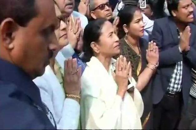 திரிணாமுல் காங்கிரஸ் எம்.பி.க்களுடன் டெல்லி பாராளுமன்ற வளாகத்துக்கு சென்ற மம்தா பானர்ஜி, அங்குள்ள மகாத்மா காந்தி சிலைக்கு மாலை அணிவித்து மரியாதை செய்து வணங்கினார்.