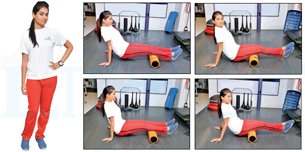 இப்போது ரோலரை முட்டிக்கு மேல் தொடைப்பகுதிக்கு கொண்டுவந்து, கைகளை தரையில் ஊன்றியநிலையில், கால்களை குறுக்காக வைத்தபடி இருக்க வேண்டும்.