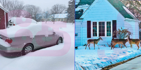 வரும்பொழுதே பனிப்புயலைக் கொண்டு வந்தீர்களா? என்று மகனும், மருமகளும் கேட்கும்பொழுதுதான் எங்களுக்குப் புரிந்தது, அந்த சமயம் வெளியில் ‘பனிப்புயல்’ பெய்து கொண்டிருந்தது என்பது. விமான நிலையத்திற்குள் இருந்ததால் வெளியே இருக்கும் பனியின் தாக்கம் எங்களுக்கு தெரியவில்லை. வெளியே வந்தால் ‘ஊ ஊ’ என்ற சப்தத்துடன் குளிர்காற்று வீசிக்கொண்டிருந்தது. எங்கள் மகன் ‘லெதர்’ உடைகள் மூலம் எங்களின் தலை முதல் பாதம் வரை மூடச் செய்து பின்னர் வெளியே காருக்கு அழைத்துச்சென்றனர். சென்னையின் டிசம்பர் பனியை பார்த்து பழகிய எங்களுக்கு, அங்கு பொருட்கள் உறைந்து கிடப்பதைப் பார்த்து ரத்தமே உறைந்து விட்டது!