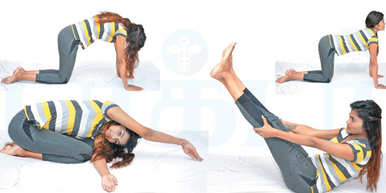 முதுகு தரையில் படும்படி விரிப்பில் படுக்கவும். முதலில் வலது கால் முட்டியை மடித்து மார்புக்கு சற்று உயர்த்திய நிலையில் முட்டியை உள்ளங்கைகளால் பிடித்துக் கொள்ளவும். மூச்சை உள்ளிழுத்தவாறே முட்டியை உள்புறமாக அழுத்தவும். 10 நொடிகள் இதே நிலையில் இருக்க வேண்டும்.