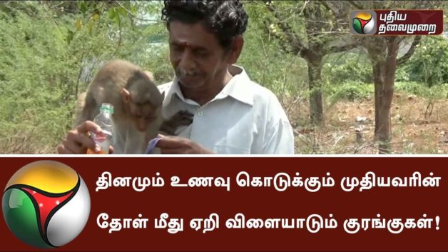 தினமும் உணவு கொடுக்கும் முதியவரின் தோள் மீது ஏறி விளையாடும் குரங்குகள்! (வீடியோ)