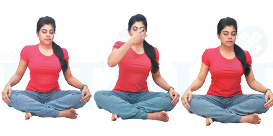 இடது மூக்கின் வழியாக மூச்சை உள்ளிழுக்கவும். இப்போது இடது மூக்கை மோதிரவிரல், சுண்டுவிரல் இரண்டாலும் அழுத்திக் கொள்ளவும். வலது மூக்கை திறந்து, இழுத்த மூச்சை வலது மூக்கால் மெதுவாக வெளியேற்றவும்.