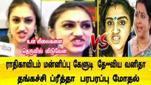 • ராதிகாவிடம் மன்னிப்பு கேளுடி தேவி**ய வனிதா தங்கச்சி பிரீத்தா பரபரப்பு மோதல்!! (வீடியோ)