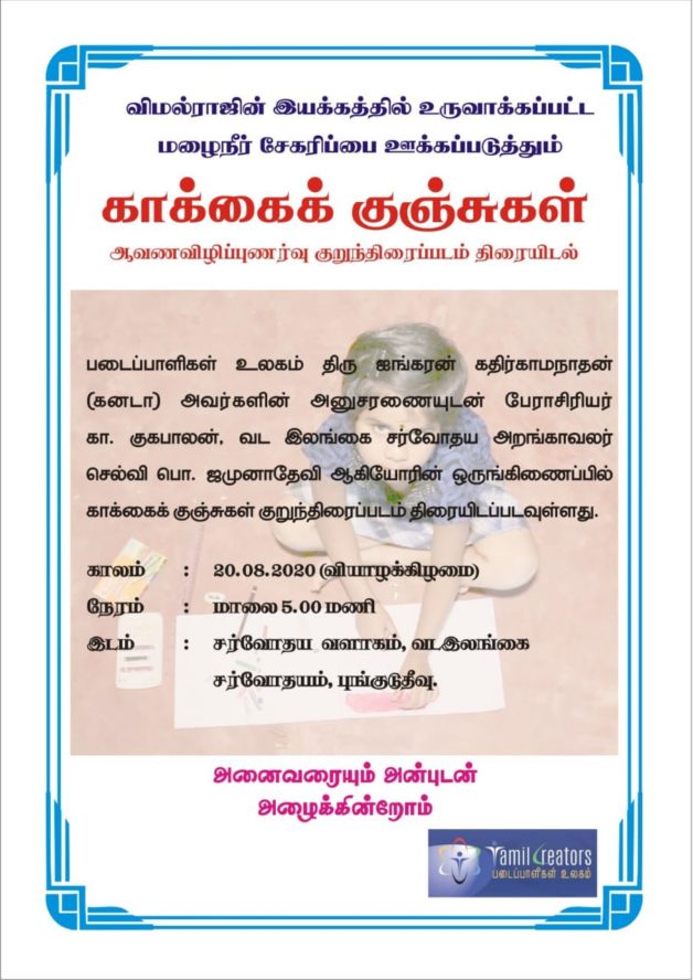 “படைப்பாளிகள் உலகம்” திரு.ஐங்கரன் கதிர்காமநாதன் (கனடா) அவர்களின் அனுசரணையில், பேராசிரியர் திரு.கா.குகபாலன், வடஇலங்கை சர்வோதய அறங்காவலர் செல்வி.பொ.ஜமுனாதேவி ஆகியோரின் ஒருங்கிணைப்பில் “காக்கைக் குஞ்சுகள்” குறுந்திரைப்படம் திரையிடப்படவுள்ளது.
