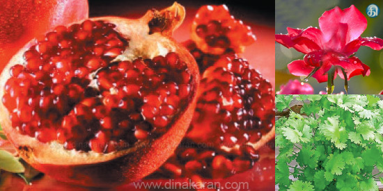 கோடைகாலத்தில் உடல் உஷ்ணமாவதால் சிறுநீர்தாரையில் எரிச்சல், கண்களில் எரிச்சல், நாவறட்சி, வியர்வை, கொப்புளங்கள், தோலில் கருமை, சுருக்கங்கள் போன்ற பிரச்னைகள் ஏற்படுகின்றன. மாதுளை உடலுக்கு குளிர்ச்சி தரக்கூடியது. இதில், கால்சியம், மினரல் உள்ளது. வயிற்றுபோக்கு, ரத்தக்கசிவை தடுக்கும் தன்மை கொண்டது. கொத்துமல்லி குளிர்ச்சி தரக்கூடியது. தோல்நோய்களை குணப்படுத்தவல்லது.