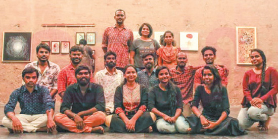 பாட்டியுடன் நான் அதிகம் பேசியதில்லை. ஆனால், அவங்க எப்படி யோசிப்பாங்க, வெளிப்படுத்துவாங்கன்னு தெரியும். அன்றிருந்த பாட்டிகளின் உடல் பலம், மன தைரியம் இன்றிருக்கும் பெண்களுக்கு குறைந்துவிட்டது” என்றார்.“நான் பயன்படுத்தியிருக்கிற வண்ணங் களில், பேப்பரில் பாட்டியுடைய நினைவு கள் உள்ளது. முறத்தில் பூசும் காகிதக் கூழ் மற்றும் வெந்தயம் கொண்டு பேப்பர் செய்திருக்கிறேன். சின்ன வயதில் பாட்டி எனக்குக் கற்றுக் கொடுத்தது. வெற்றிலை, சுண்ணாம்பு, கொட்டப் பாக்கு மூன்றையும் அரைத்து அதிலிருந்து வண்ணங்களை உருவாக்கியிருக்கேன்” என்றவர் தன் ஓவியங்களை பற்றி விவரித்தார். “இந்த கோலம் பாட்டி போட்டது. ஊரிலேயே கோலத்துக்கு ஃபேமஸான ஆள் பாட்டி. ரோட்டில் போகும் போது ஏதாவது ஒரு கோலத்தை பார்த்தால், உடனே வீட்டிற்கு வந்து அதை அப்படியே வரைந்து பார்ப்பாங்க.