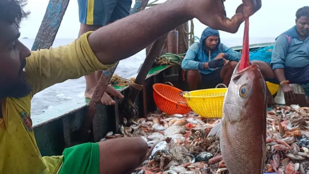 விசைப்படகில் பிடிபட்ட சீறும்பாம்பும் வித்தியாசமானமீன்களும்!! (வீடியோ)