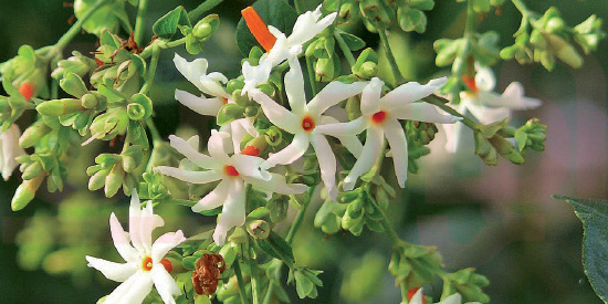 *பவளமல்லி, பவழமல்லி, பாரிஜாதம், நைட் ஜாஸ்மின் என்று பல பெயர்களில் குறிப்பிடும் இது குறு மரவகையைச் சேர்ந்தது.