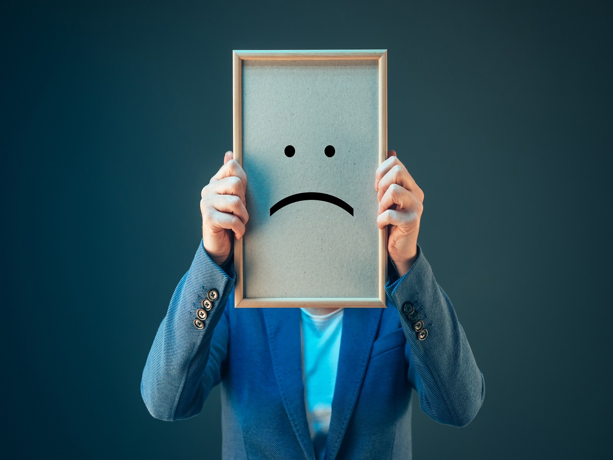 • Businesswoman is pessimistic, holding smiley emoticon over face