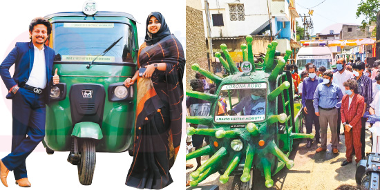ரிமோட்டை இயக்கினால் ரோபோ ஆட்டோவில் இருந்து இறங்கி தடைசெய்யப்பட்ட பகுதிகளில் மருந்தை தெளிக்கத் தொடங்கும். இதில் மக்களுக்கு இலவச கபசுரக் குடி நீர், இலவச முகக் கவசங்கள், கை சுத்தம் செய்யும் சானிடைசர்களையும் வழங்கினோம். மினி ஆம்புலன்ஸாகவும் ஆட்டோவை ரெடி செய்து வைத்துள்ளோம். உபயோகத்தில் உள்ள பெட்ரோல், டீசல் ஆட்டோக்களையும் எலெக்ட்ரிக் ஆட்டோவாக மாற்றித் தரும் ரெட்ரோபிட்(retrofit) முறையும் எங்களிடம் உள்ளது. இப்போது நிறைய ஆர்டர்கள் வரத் தொடங்கியுள்ளன. காய்கறி ஆட்டோக்களுக்கு நிறைய ஆர்டர் வருகிறது. 5 மினி உணவக ஆட்டோவை பாண்டிச்சேரிக்கு தயாரித்துக் கொடுத்துள்ளோம். அதேபோல் தையல் மெஷின் பொருத்திய ஆட்டோக்கள் மூன்றை தயாரித்து வழங்கியுள்ளோம். ஒரு ஆட்டோவிற்கு 3 லட்சத்தில் ஆரம்பித்து 5 லட்சம் செலவாகும். இது தொழிலுக்குத் தேவையான உள் கட்டமைப்பும் சேர்ந்தது. அதாவது மெஷினரி ஓரியன்டெட். காய்கறி விற்பனை என்றால் வெஜிடபிள் ட்ரேஸ் இன் பில்டாய் உள்ளே இருக்கும். கஃபே ஷாப் எனில் அதற்கான பொருட்கள் இணைக்கப்பட்டு இருக்கும். தொழிலுக்கென எதையும் வாங்கத் தேவையில்லை.