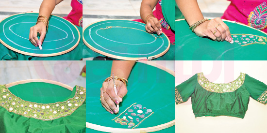 மாலை நேரப் பார்ட்டிகளுக்கு நண்பர்களுடன் செல்லும்போது, ஒரே நிறத்தில் இருக்கும் புடவையினை சற்று கூடுதலாக எடுத்துக்காட்ட, போட் வடிவ கழுத்துப் பகுதியினை வடிவமைத்து, பலவடிவ மிரர் வேலைப்பாடுகளால் கூடுதல் அழகூட்டி, தோழி வாசகர்களுக்கு கழுத்து மற்றும் கைப் பகுதிகளை வடிவமைத்துக் காட்டுகிறார் மோகன் ஃபேஷன் டிசைனிங் நிறுவன இயக்குநர் செல்வி மோகன் தலைமையில் பயிற்சியாளர் காயத்ரி.