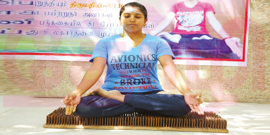 மிஸ்ட்டி என்னும் 12 வயது குழந்தை இரண்டரை நிமிடத்தில் 103 ஆசனங்களை நிகழ்த்தி சர்வதேச விருது பெற்றது எனது பயிற்சியில் ஒரு துளியாகும். அதுபோல பத்தாம் வகுப்பு படிக்கும் கல்வியரசு என்னுடைய மனோதிடப் பயிற்சியால் கறுப்புத் துணியால் கண்ணைக் கட்டிக்கொண்டு ஒன்றரைக் கிலோ மீட்டர் ஸ்கேட்டிங் மூலம் உலக சாதனைப் படைத்துள்ளார். மற்றொரு சிறுமி திரித்தி 5வது தான் படிக்கிறாள். மூன்றடுக்கு பானை மீது அமர்ந்து இருபது நிமிடம் அவள் பத்மாசனம் செய்த சாதனை பலரையும் வியப்பில் ஆழ்த்தியது. இதுபோல மாணவர்களின் சாதனைகளைப் பட்டியலிட்டுக்கொண்டே போகலாம். எனது சாதனையில், நான் மிகவும் அரிதாகக் கருதுவது 2555 ஆணி கூர்முனைகள் மீது 51 ஆசனங்கள் நிகழ்த்தி பெண் பாலியல் வன்கொடுமை விழிப்புணர்வுக்காக போராடியதை பாக்கியமாகக் கருதுகிறேன்’’ என்றவர் பெண்கள் ஆரோக்கியம் குறித்து பல விழிப்புணர்வு நிகழ்ச்சியினை நிகழ்த்தி வருகிறார்.