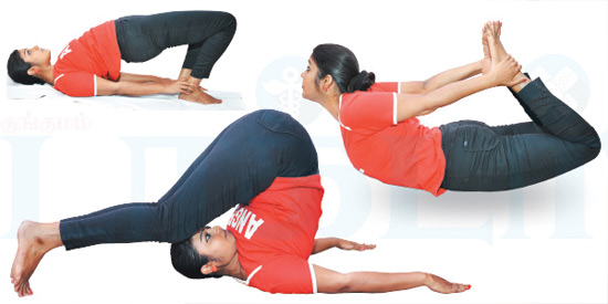 தரையில் நேராக படுத்து கைகள் இரண்டையும் பக்கவாட்டில் வைத்துக் கொள்ள வேண்டும். கால்களை மடக்கி, மூச்சை உள்ளிழுத்தவாறு இடுப்பை மேலெழுப்ப வேண்டும். கைகளால் கால் மணிக்கட்டுகளை பிடித்துக் கொள்ளவும். தோள்பட்டை மட்டும் தரையை ஒட்டி இருக்க வேண்டும். இந்த நிலையில் 10 நொடிகள் இருக்க வேண்டும்.