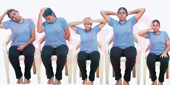 நேராக நிமிர்ந்து உட்கார்ந்த நிலையில் செய்ய வேண்டியது…(படத்தில் காட்டப் பட்டிருப்பதைப் பின்பற்றி கீழ் வரும் நிலைகளைச் செய்யும்போது, கழுத்துப் பகுதியில் ஸ்ட்ரெட்ச்(stretch) உணர்வு கிடைக்கும். வலி ஏற்பட்ட இடத்தில் இயங்காமல் இருந்த சதைகள் இலகுவாகி, நரம்புகள் தூண்டப்பட்டு, ரத்த ஓட்டம் சீரடையும்)
