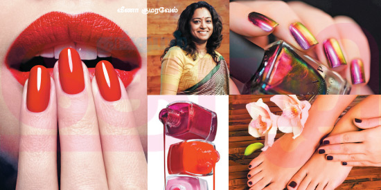 ஜீன்ஸ் தெரியா குக் கிராமத்திலும் கூட பெண்கள் வண்ணமயமாக நெயில் பாலிஷ் பயன்படுத்தும் அளவிற்கு நம் காஸ்மெட்டிக் பெட்டிகளில் நெயில் பாலிஷ் தவிர்க்க முடியாத ஒன்று. சரி நாம் இப்போது பயன்படுத்தும் நெயில் பாலிஷ்களும், அதன் முறையும் சரிதானா? அதனை எவ்வாறு பயன்படுத்த வேண்டும் என்று கலர்ஃபுல்லாக பேச ஆரம்பித்தார் பிரபல ஸ்பா உரிமையாளர் வீணா குமரவேல்.‘‘ஒவ்வொரு பெண்ணுடைய விரல்களையும் அழகாக எடுத்துக்காட்டுவது நகங்கள். மேலும் ஒருவரின் உடல் ஆரோக்கியத்தையும் சுட்டிக்காட்டுவதும் நகங்கள் தான். அழகு மற்றும் ஆரோக்கியம் இரண்டிற்குமே பக்கபலமாக இருக்கும் நகத்தினை நாம் மிகவும் கவனமாக பாதுகாத்துக் கொள்வது அவசியம்.
