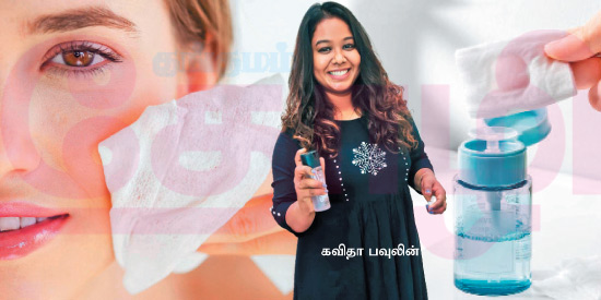 நம்ம உடலிலேயே முக சருமம்தான் ரொம்ப மென்மையா இருக்கும். பெண்கள் இப்போது எல்லா துறையிலும் வளர்ந்து வருகிறார்கள். வேலைக்காக ெவளிநாட்டிற்கும் செல்கிறார்கள். அது மட்டுமில்லாமல் ஏதாவது ஒரு விசேஷத்திற்கு செல்ல வேண்டும் என்றாலும் தங்களை அழகாக எடுத்துக்காட்ட நினைக்கிறார்கள். அதற்கு மேக்கப் அவசியம். அதே சமயம் அதை ரிமூவ் செய்யறதும் அவசியம். இல்லைன்னா ரொம்ப சீக்கிரமே சருமம் சுருக்கங்கள், பருக்கள்னு வயசான தோற்றத்தை கொடுக்க ஆரம்பிச்சுடும்’’ என்னும் கவிதா மேக்கப் ரிமூவர் பயன்படுத்தும் முறைகள் குறித்து விளக்கினார்.