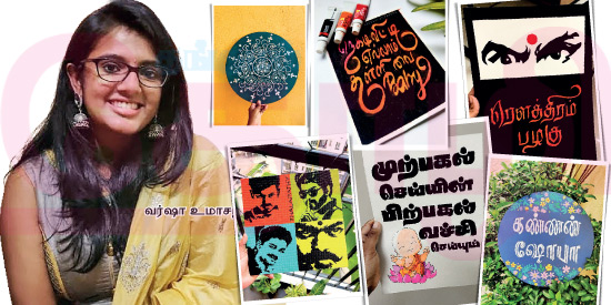 ஆர்ட்பீட் பை வி (artbeat.by.v) எனும் இன்ஸ்டாகிராம் பக்கத்தில் அழகான தமிழ் பெயர் பலகைகள், தமிழ் டைப்போகிராஃபி போஸ்டர்கள் மூலம் ஃபாலோவர்ஸை அள்ளி வருகிறார் சென்னையைச் சேர்ந்த வர்ஷா உமாசந்தர். கைகளாலேயே இந்த பரிசுப் பொருட்களை உருவாக்கும் இவர், இப்போது குஜராத்தில் மட்டுமே பிரபலமான லிப்பான் கலையை சென்னையிலும் செய்து வருகிறார்.