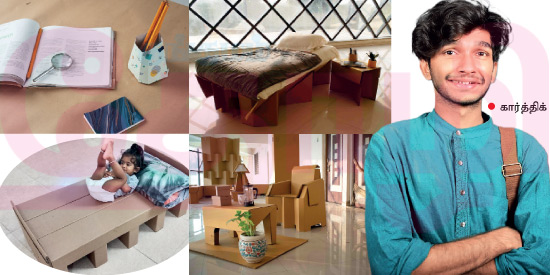 “கார்டுபோர்ட் எப்படி இவ்வளவு உறுதியாக இருக்கிறது? தண்ணீரோ அல்லது எண்ணெய் பட்டாலோ ஏதும் ஆகாதா? என்கிற கேள்வி வரலாம். நாங்கள் உபயோகிக்கும் கார்டுபோர்ட் தரம் மிக்கது. அடுத்து வாட்டர் & ஆயில் ஃப்ரூப் கொண்டது. துடைத்தால் போதும். ஒன்றும் ஆகாது. உறுதியாக இருப்பதற்கேற்றார் போல் வடிவமைக்கிறோம். இதை பயன்படுத்துபவர்கள் எளிதாக எங்கேயும் எடுத்துக் கொண்டு போகலாம். ஈக்கோ ஃபிரண்ட்லி. மாணவர்களுக்கு ஏற்றது.